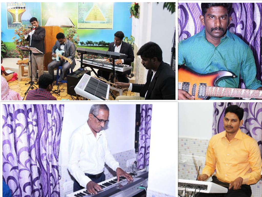 Bro. Thomson is the senior musician. He and his son Johnson plays the keyboard. Bro. Moses Israel and Moses Jeyanantham plays the guitar. Simon Peter leads the youth music troupe and he is a professional Flute player. He and his team organize the music notes and lead the worship songs with their musical instruments during special prayer meetings. They also conduct instrumental worship during special occasion like New Year, etc.