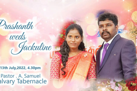 Media information about this sermon Title: Marriage – Prashanth weds JackulineType: MediaAudio Format: MP3Video: YouTubeAuthor: Pastor A. SamuelLanguage: TamilEvent: Marriage Session: EveningTotal Duration: 1 Hour 11 Minutes Note: For any questions, please reach us from here