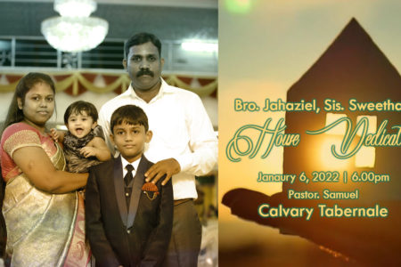 Media information about this sermon Title: House Dedication – Bro. JahazielType: MediaAuthor: Pastor A. SamuelLanguage: TamilEvent: Special Prayer Session: EveningTotal Duration: 1 Hour 36 Minutes Note: For any questions, please reach us from here